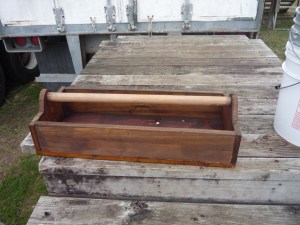 The joints look remarkably tight in this photo, and the stain quite even, but don’t be fooled.  This is about as rough as work gets.  (Not including the Clock, which may be finished and rejected this week…)   It was the first attempt at an entire project like this by the student.  He cut the wood from the original 1×11, sanded the parts to his specifications, measured and attached the handle without major intervention by the teacher.  Pretty darn good for a nine-year old.