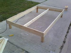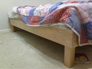 The rails are 1x6s with a 1x4s used as the rails on which the bed/box spring sits against. I mounted the legs, from IKEA, using wood screws. All in all, this bed frame cost about $150 in materials versus the $170 for an IKEA boxspring & legs. Not enough savings to make it worthwhile, especially as I’m “factory-fit” challenged.