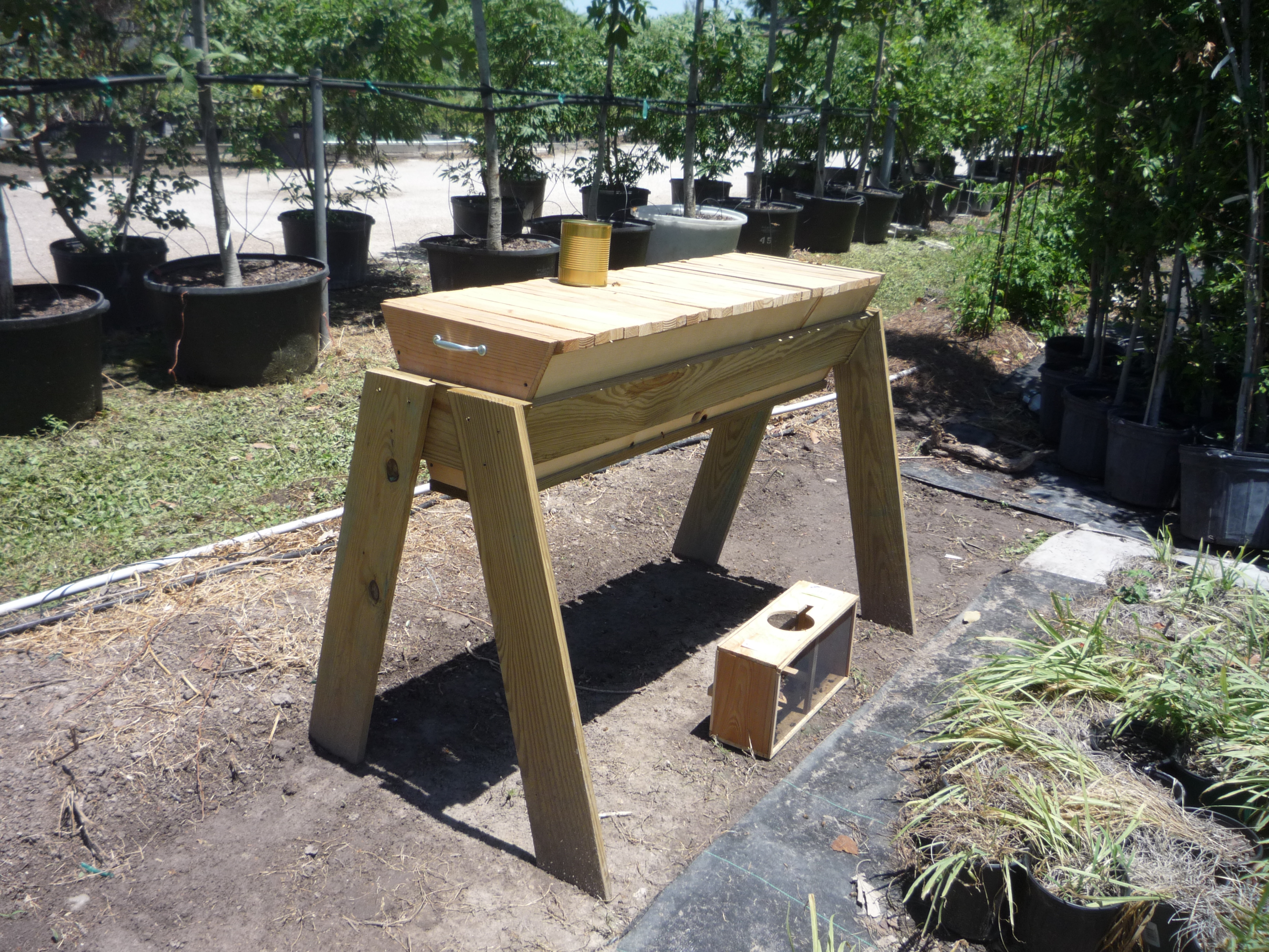 Treesearch Farms recently held an open house and graciously included a seminar on raising bees. They advocate organic growing techniques and organic bee raising. The bees pollinate your garden, which promotes healthy fruit and vegetable growth. In fact, one bee colony in one backyard can pollinate every garden in a five mile radius! (Don’t want bees in your yard? Put them in your neighbor’s yard!) To them, organic/natural/community & local-based beekeeping can be an antidote to the colony collapses of the last ten years, as natural and locally-raised honeybees do not undergo the amount of stress that commercial bees do. They pointed their attendees to Mike’s Top Bar Hives, a simple, elegant and ancient bee hive design which mimics natural bee hive construction and helps prevent some of the major stressors involved in colony collapse.