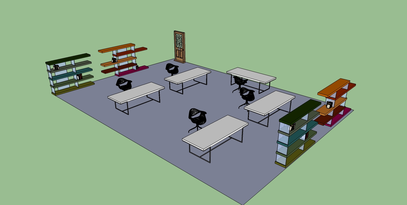U shape lecture with stuff at walls.