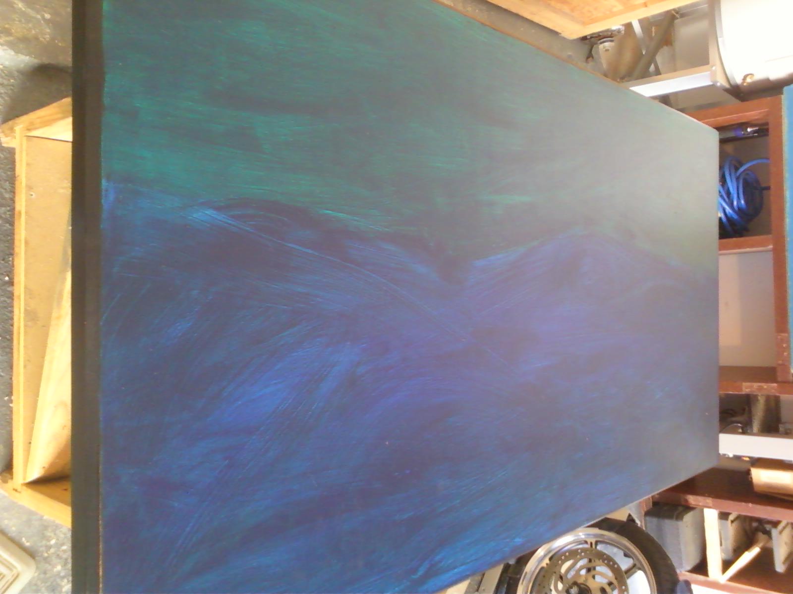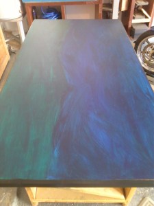 Here’s a quick shot of my “draft” top for the dining room table. I’m playing with the paints a bit, yah? Wondering what you think – I’m on the fence about the whole idea but the more I play, the more this stormy landscape comes into being. Just like when I write poetry, I can’t do it too long or I get worried about myself!